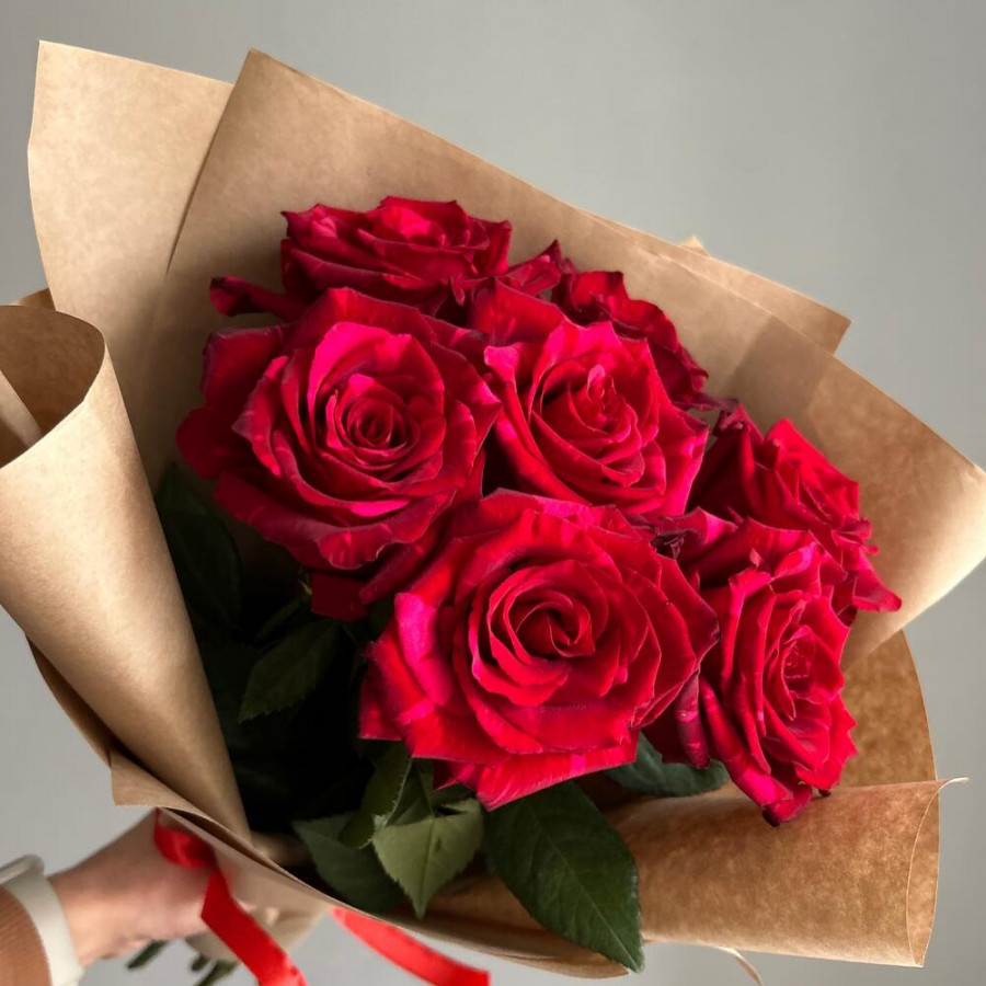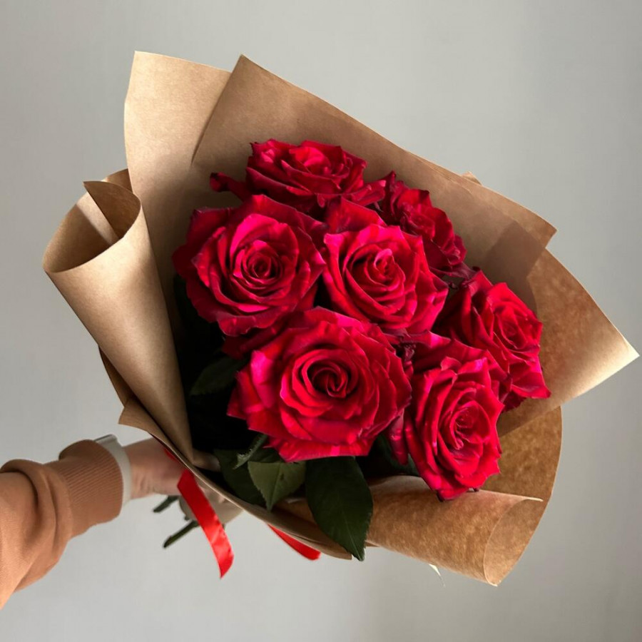 На фото букет из 7 красных роз. В составе: роза 7 шт, крафт-бумага 1 шт, атласная лента 1 шт, . Все цветы свежие и ароматные, букет красиво оформлен и отлично подходит для подарка. Доступна доставка цветов или самовывоз.