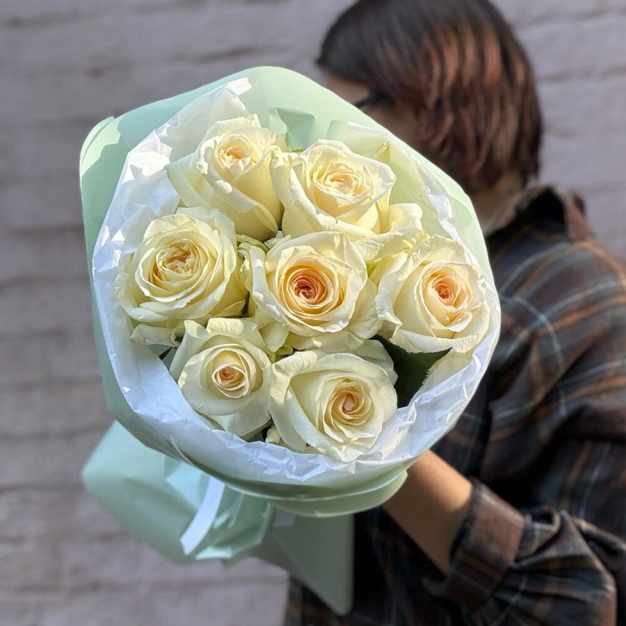 На фото 7 кремовых роз. В составе: роза 7 шт, дизайнерская упаковка 2 шт, атласная лента 1 шт, . Все цветы свежие и ароматные, букет красиво оформлен и отлично подходит для подарка. Доступна доставка цветов или самовывоз.
