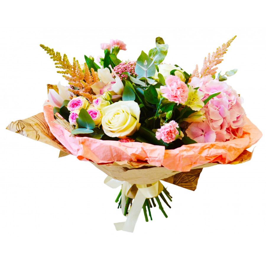 Восхитительно нежный букет из сочетания эквадорских и кустовых роз с величественными орхидеями, пышным облаком розовой гортензии и экзотической астильбой станет достойным подарком для самой изысканной и предвзятой натуры - первой красавицы Парижа!
